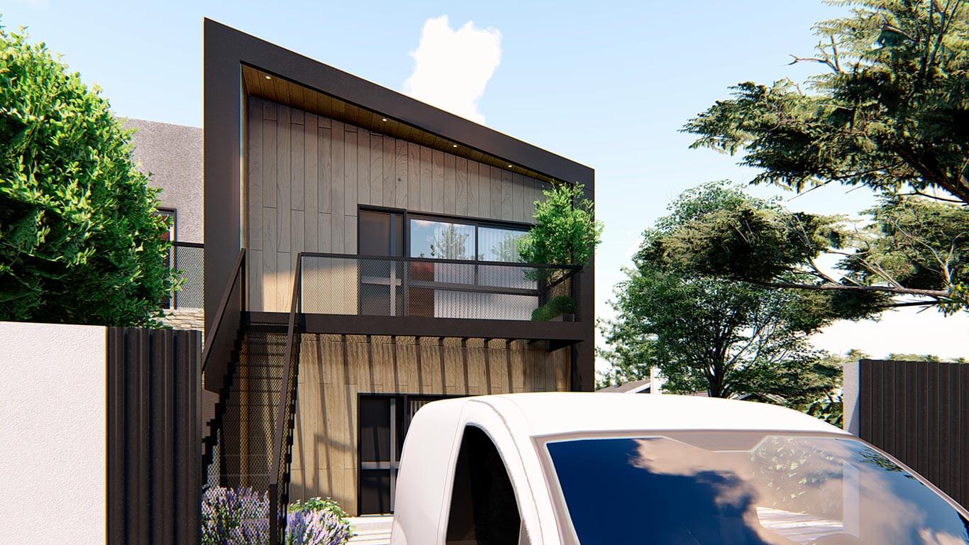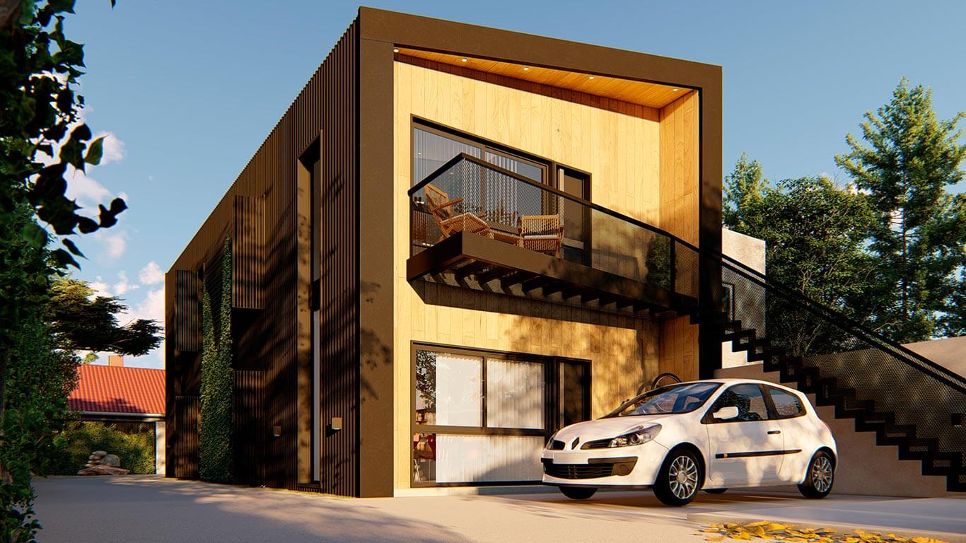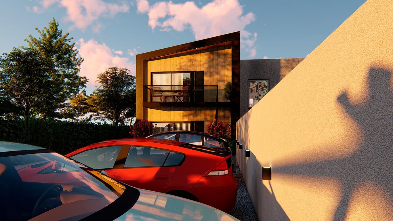 Esta envolvente se desintegra en el frente y contra frente en combinación de vidrio y revestimiento símil madera para generar los accesos y aprovechar las orientaciones E y O.