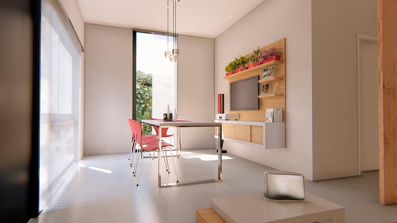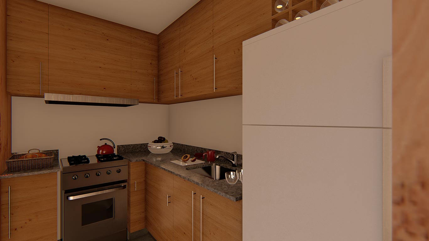 Una vez dentro de los departamentos divisiones realizadas con perfiles metálicos y placas de roca de yeso + placas de mdf 18mm símil madera terminan por conformar los ambientes, baño completo, habitación, cocina y estar comedor integrados.